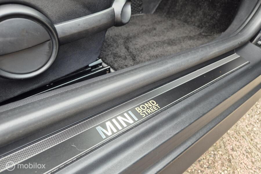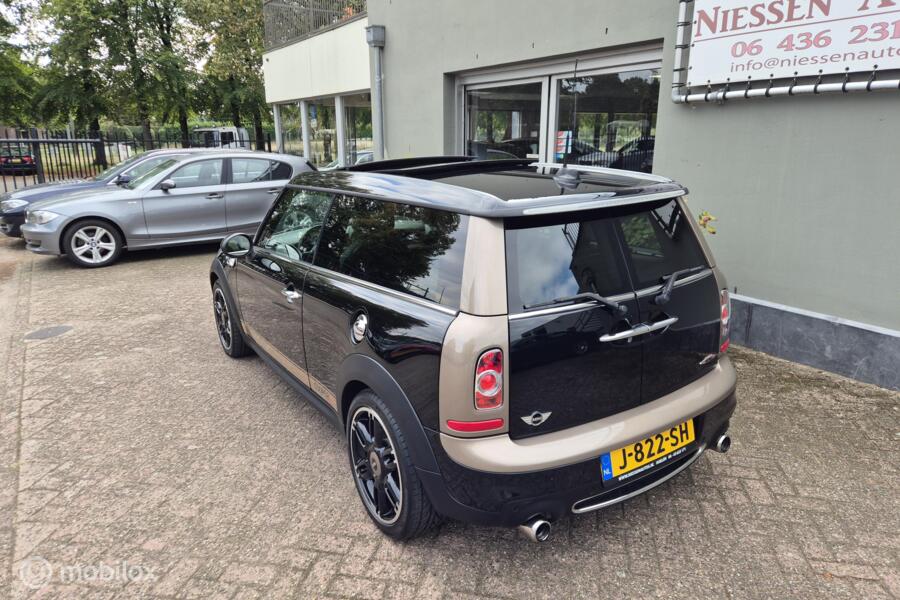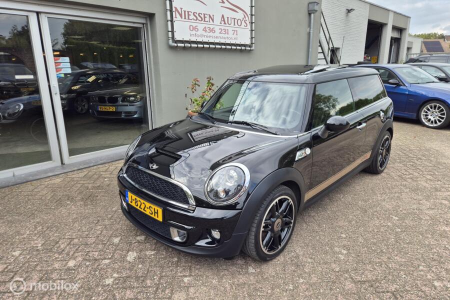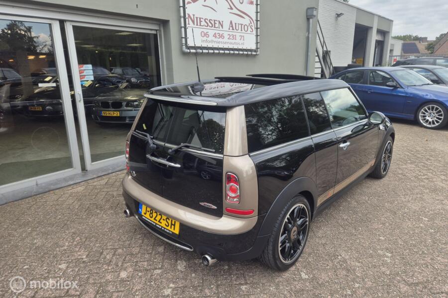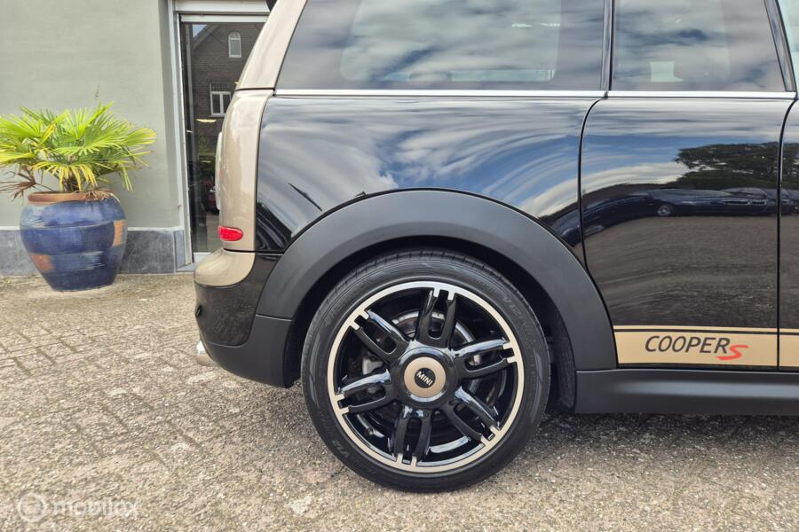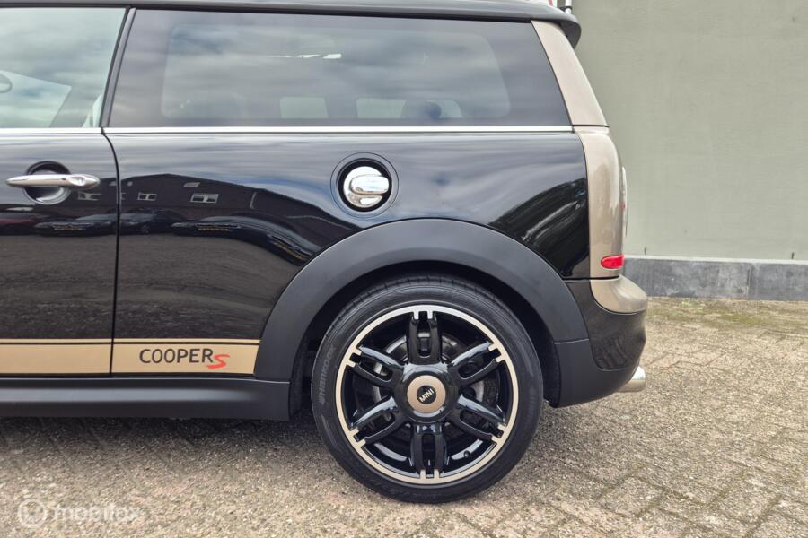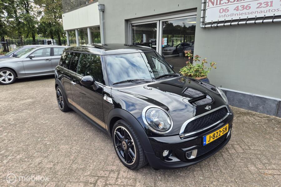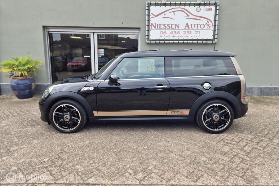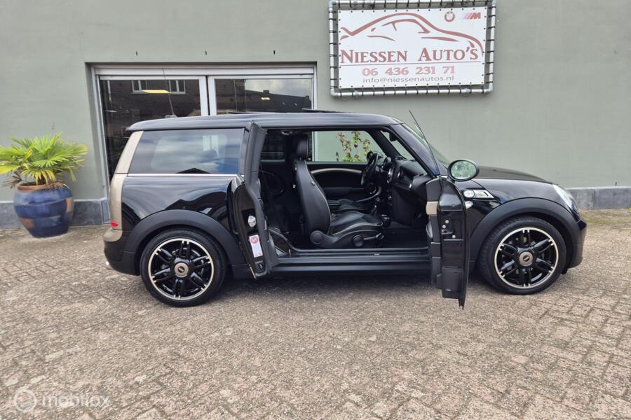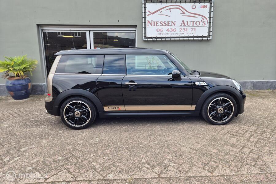 Mini R55 Facelift Cooper S Clubman Bond Street Edition aangeboden. De Mini is uitgevoerd in de stoere kleur Midnight Black Metallic die het samen met de Accenten in de kleur Cool Champagne & 17 inch Twin Spoke velgen in dezelfde kleurcombinatie een zeer sportieve verschijning maakt. Qua interieur is er gekozen voor een lederen sport interieur incl stoelverwarming & lederen dashboard. Om het af te maken is de Mini voorzien van een antraciet kleurige dak hemel incl panoramadak. Motorisch is de MINI voorzien van de 184pk N18 motor die gekoppeld is aan automatische versnellingsbak incl schakelflippers aan het stuur. Recent is de Mini voorzien van een onderhoudsbeurt incl nieuwe klepsteelrubbers. De complete onderhoudshistorie & Nationale Autopas (NAP) zijn aanwezig. Enkele verdere opties van deze "Bond Street Edition" uitvoering zijn: Sport Onderstel, Glasdak, Xenon verlichting, Parkeersensoren achterzijde, Vlakke Laadvloer, Verduisterde ruiten, HiFi-systeem Harman Kardon, Regeling Combox, Navigatiesysteem etc.
